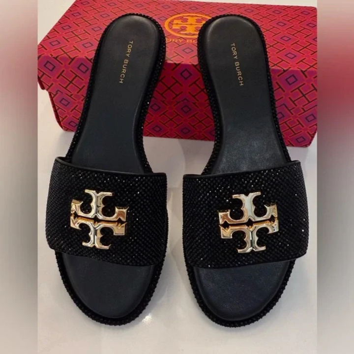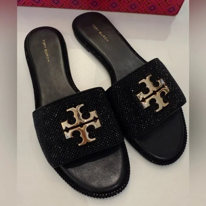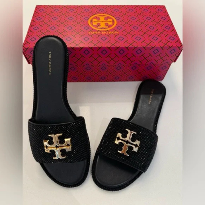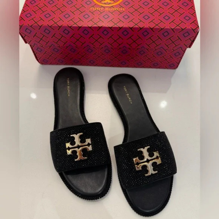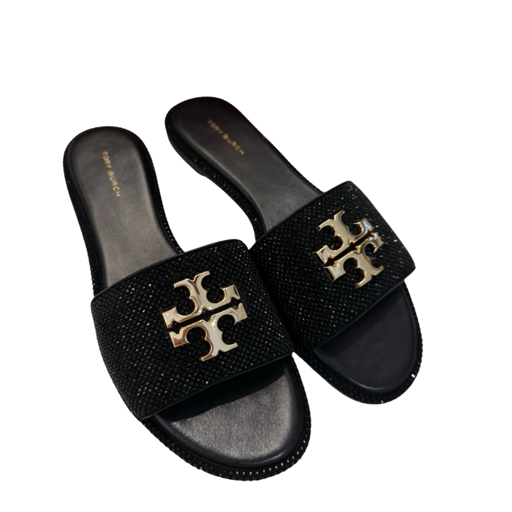 The Tory Burch Everly Slide Sandals bring refined glamour to everyday wear.